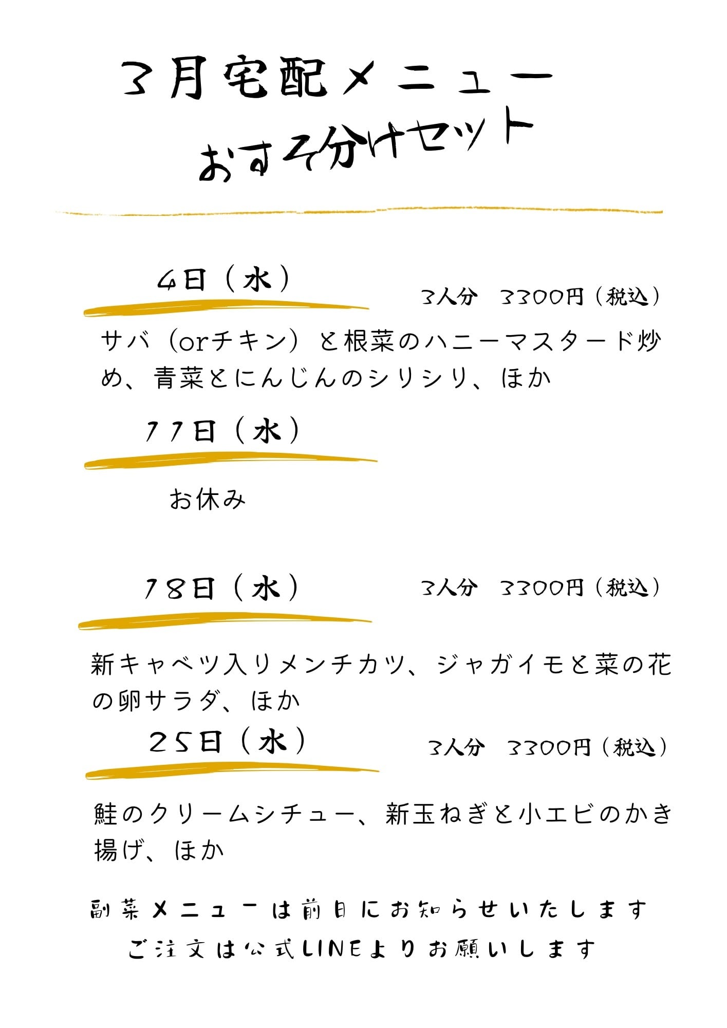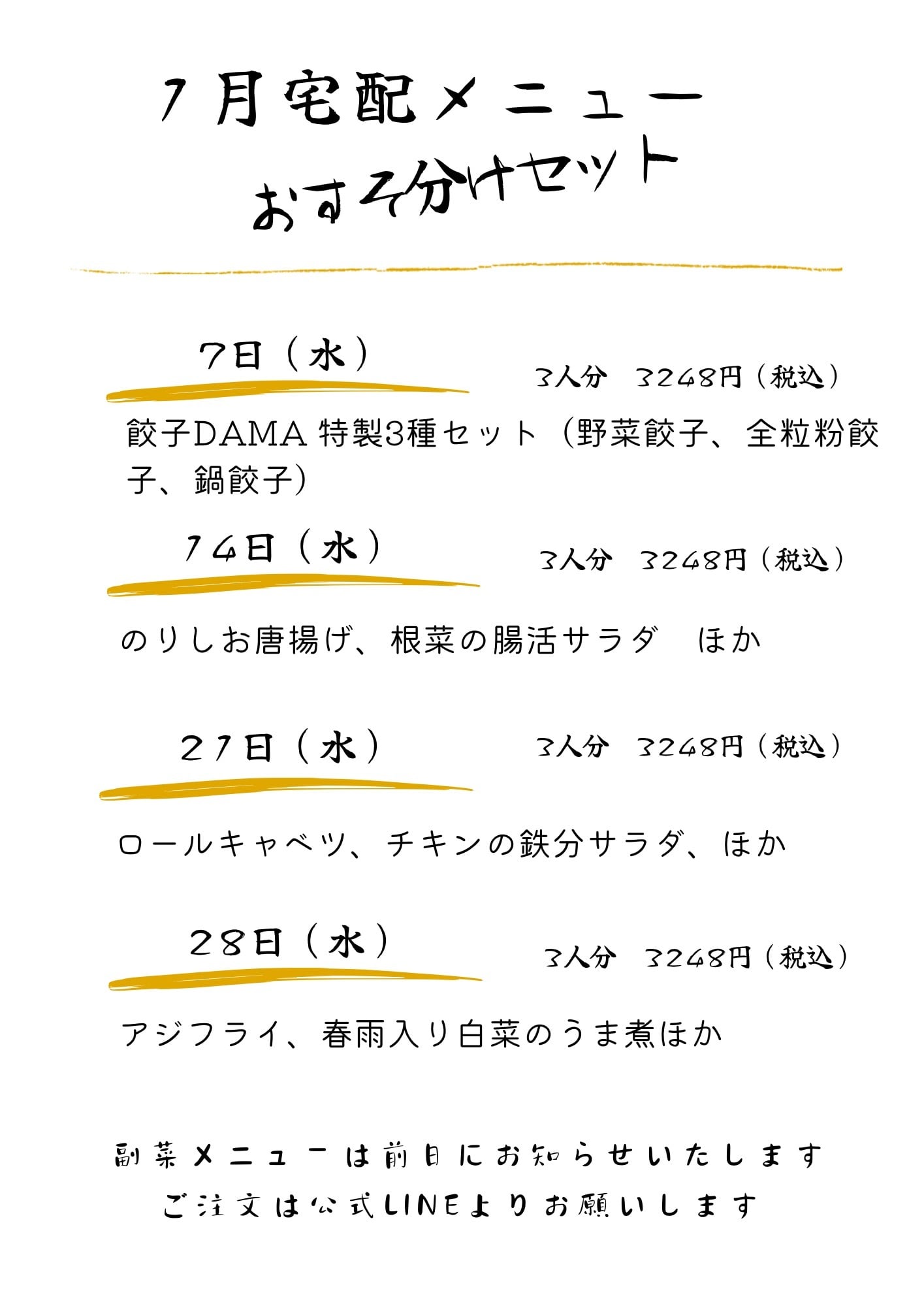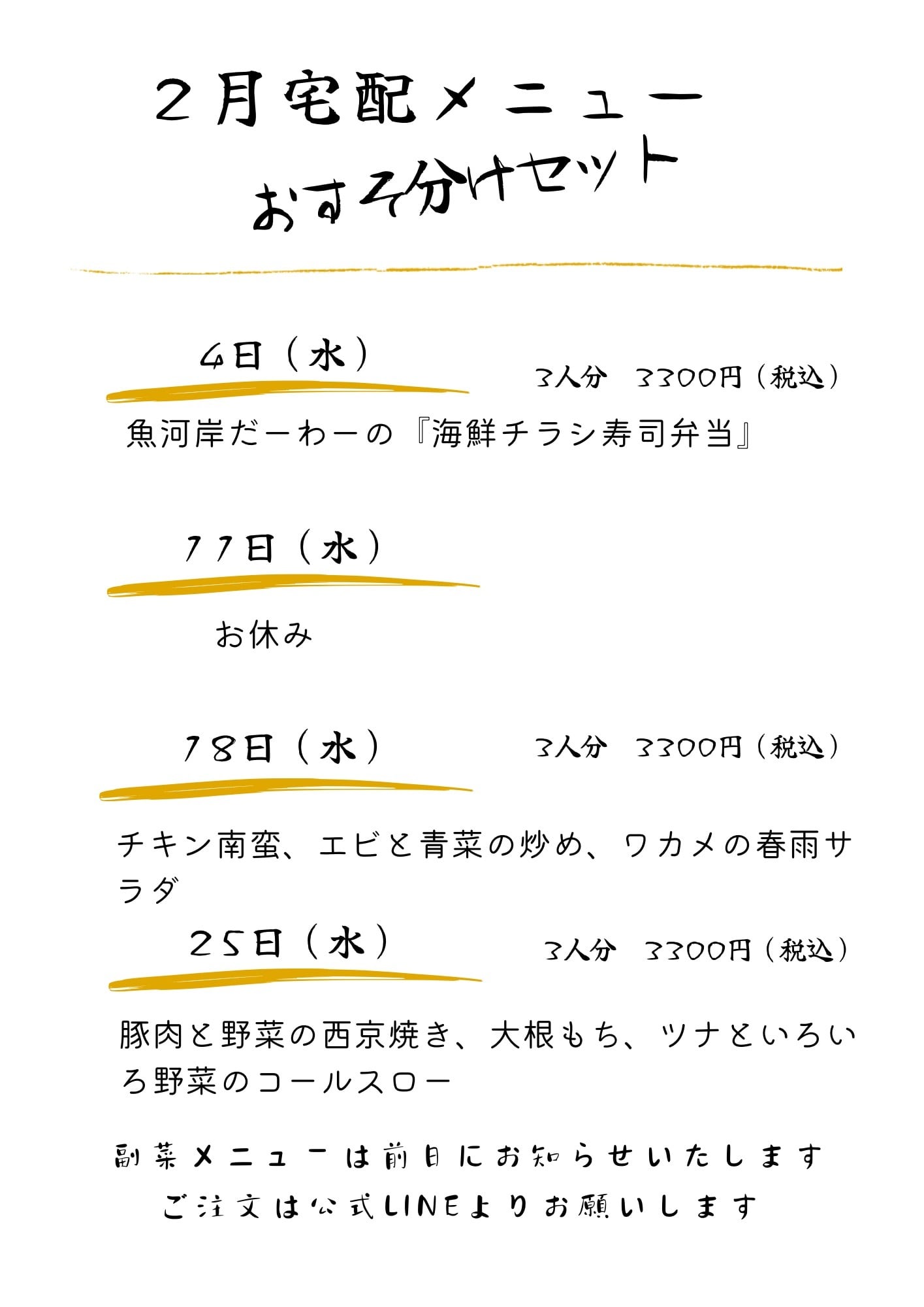 【水曜日の夕方17:00〜18:30は宅配サービス専用メニュー『おすそ分けセット』を販売しています ✨】